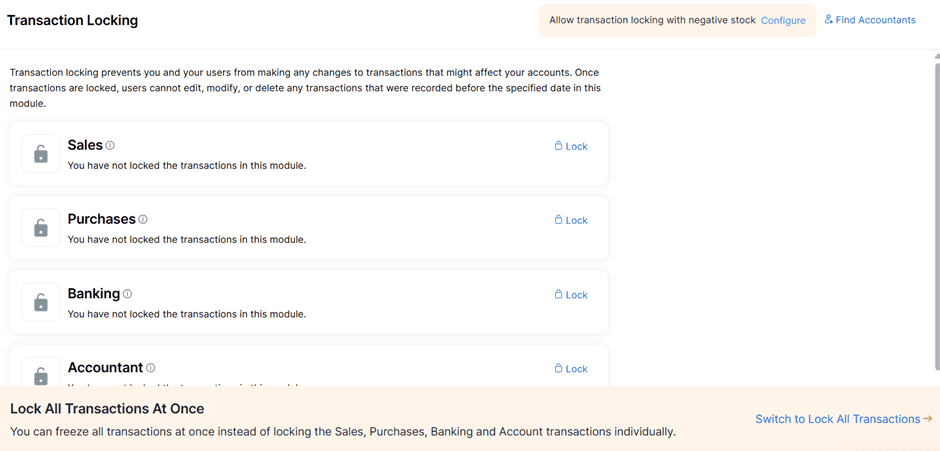 Most modern accounting platforms provide the ability to lock transactions up to a specific date. For example, systems such as Zoho Books offer functionality to lock past-period transactions either module-wise or across the entire system.